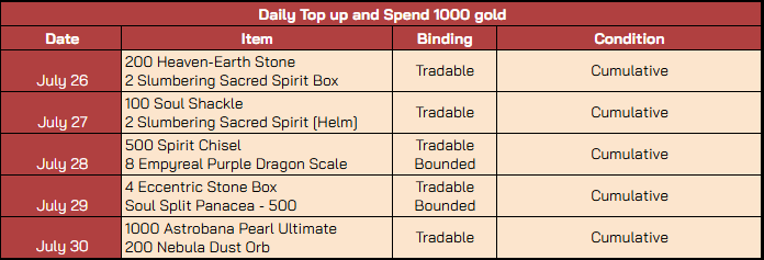 - Players must top up and spend the gold on the respective days to receive that day’s rewards. Rewards from one day cannot be obtained by topping up and spending gold on another day.