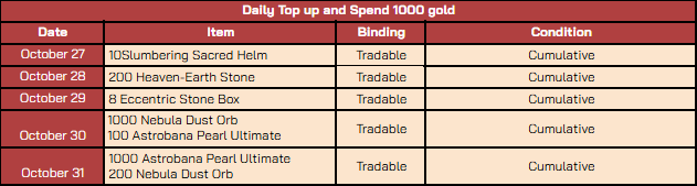 - Players must top up and spend the gold on the respective days to receive that day’s rewards. Rewards from one day cannot be obtained by topping up and spending gold on another day.