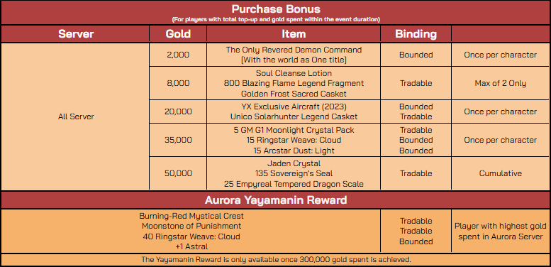 - For every 1,000 top-up and purchase amount from the Item Mall within the promo duration, you will get the following bonus rewards from the table below.