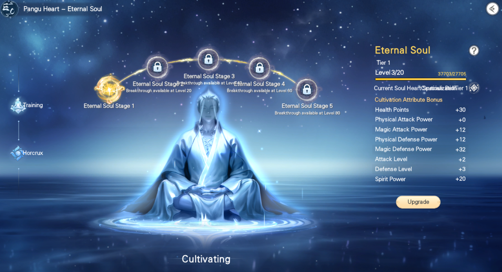 Horcruxes are divided into 5 tiers. The higher the tier of a Horcruxes, the higher its level cap and the higher the required Soul Stage for equipping it. Players can improve their Soul Stage and break through Soul Stages through cultivation, thereby equipping Horcrux of higher tiers. Different Horcrux can be equipped or unequipped by clicking the “Replace” button on the Horcrux details screen.