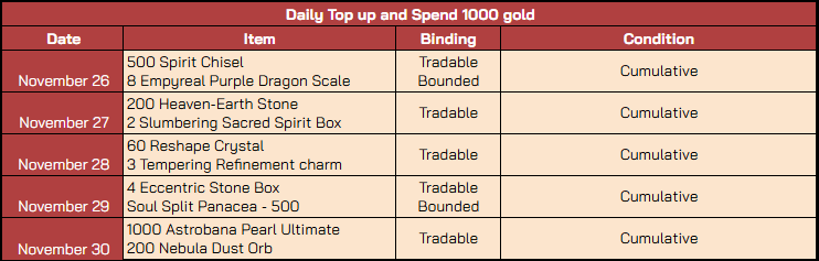 - Players must top up and spend the gold on the respective days to receive that day’s rewards. Rewards from one day cannot be obtained by topping up and spending gold on another day.