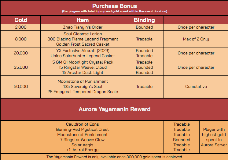 - For every 1,000 top-up and purchase amount from the Item Mall within the promo duration, you will get the following bonus rewards from the table below.