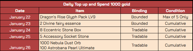 - Players must top up and spend the gold on the respective days to receive that day’s rewards. Rewards from one day cannot be obtained by topping up and spending gold on another day.